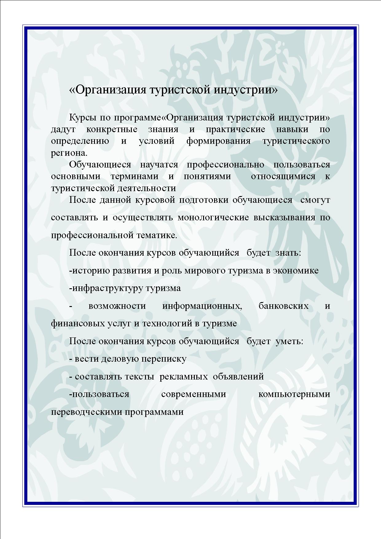 Описание курсов 1.Веб-дизайн 2. Газоэлектросварщик 3. Компас-3Д 4.Гранд-Смета 5.Облицовщик 6.Оператор ПК 7.Организация туристической деятельности